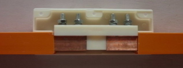由于導軌本體導電銅合金材料的硬度是導軌本體鋁合金材料的5倍,故而集電器的金屬石墨電刷可與導電銅合金本體直接摩擦接觸來拾取電能,從而舍去V型不銹鋼帶。(注:導軌本體鋁合金與V型不銹鋼帶的嵌入清潔度和密實度不可能做到100%,從而易在氣隙之間生成氧化膜形成接觸電阻,使集電器電刷與V型不銹鋼帶直接滑動接觸時形成電流瓶頸,從而使集電器電刷與V型不銹鋼帶爍傷跳火粘接,****終將拉拽掉不銹鋼帶)。